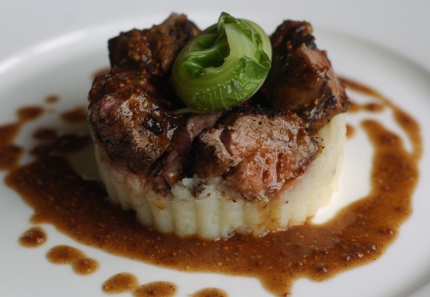 Fill to the top with the cauliflower puree and make the top level, then carefully remove the pastry cutter. Slice the fillets and arrange on top of the cauliflower, and carefully drizzle the sauce around the plate and small amount over it.