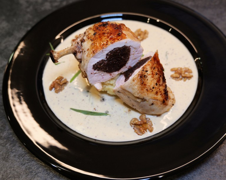 5. Remove the tarragon leaves from the branches and reserve 3/4 for the sauce. Finely chop the remaining ¼ and stir into the black pudding stuffing, then season with salt and black pepper. Refrigerate the black pudding stuffing until needed.