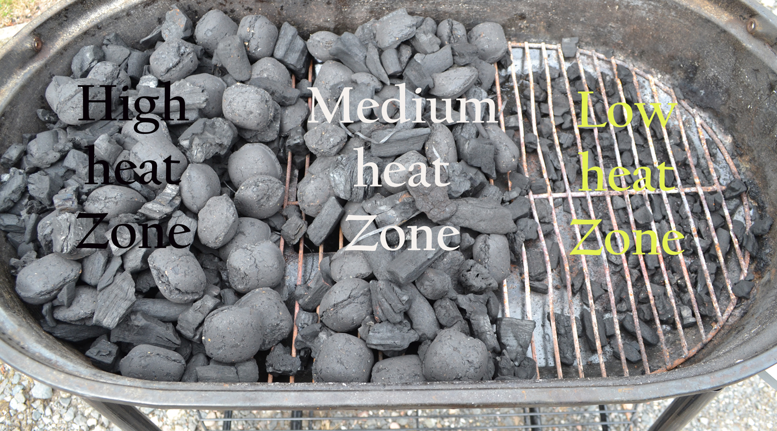 Direct Method Image a rectangular BBQ grill, fill one-third of it with a high stack of charcoal, the middle third with a medium stack of charcoal and the final third leave empty. So you have created 3 heat zones…High…medium…and low (the empty third will get sufficient radiated heat. Now you have 3 heat zones you will have much more control and your confidence will grow so you can be more adventurous in what you cook (I have even baked a cheesecake on the Barbie). If your barbecue is round then think of a pie chart and again divide your grill into thirds (see photo).