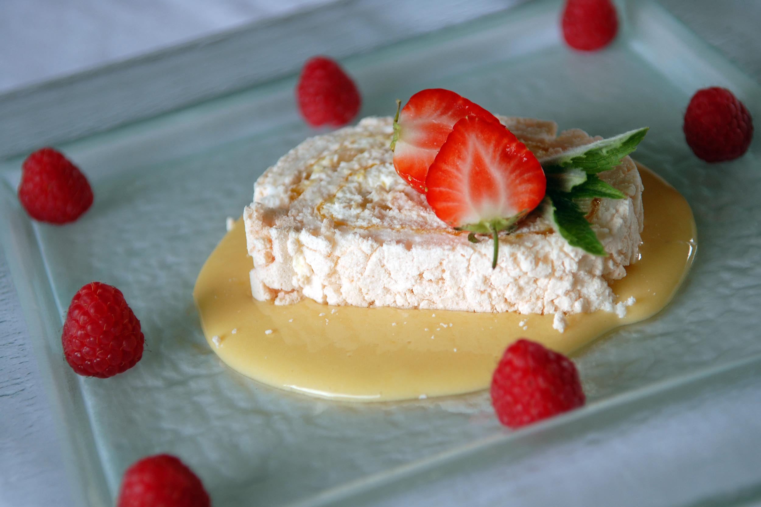 Gently unroll the cool meringue and spread the cream on evenly. Next spread half the lemon curd on top of the cream then gently roll up as neat and tight as you can. Allow to set for one hour in the fridge before cutting into portions and serve with the remaining lemon curd. Cut the roulade using a sharp carving knife using a sawing motion (and not pressing down), so you don’t make the slices look crushed. Thin the remaining half of lemon curd with a little double cream (*up to100 ml) so it can be spoon onto the bottom of the plate.