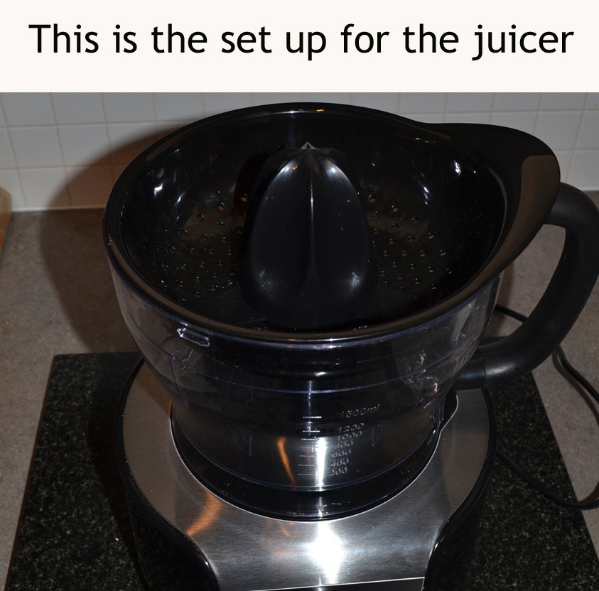 A Citrus press to squeeze oranges, lemons etc. The juicer sits onto of the large bowl and has to lock into place by the handle so you can switch it on.