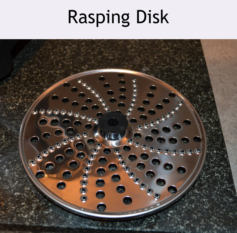 The Julienne cutter disk is pretty self-explanatory and cuts vegetables or fruit into long thin strips. The Rasping Disk is ideal for grating parmesan cheese or hard stale bread you wish to turn into breadcrumbs.